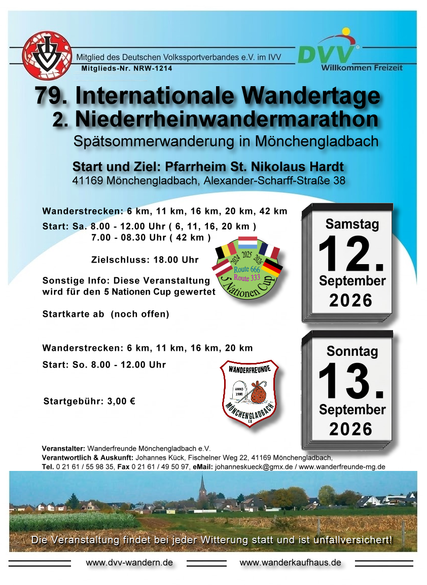 Termine bitte vormerken und die Wandertage der Wanderfreunde Mönchengladbach in Eurer Planung berücksichtigen.